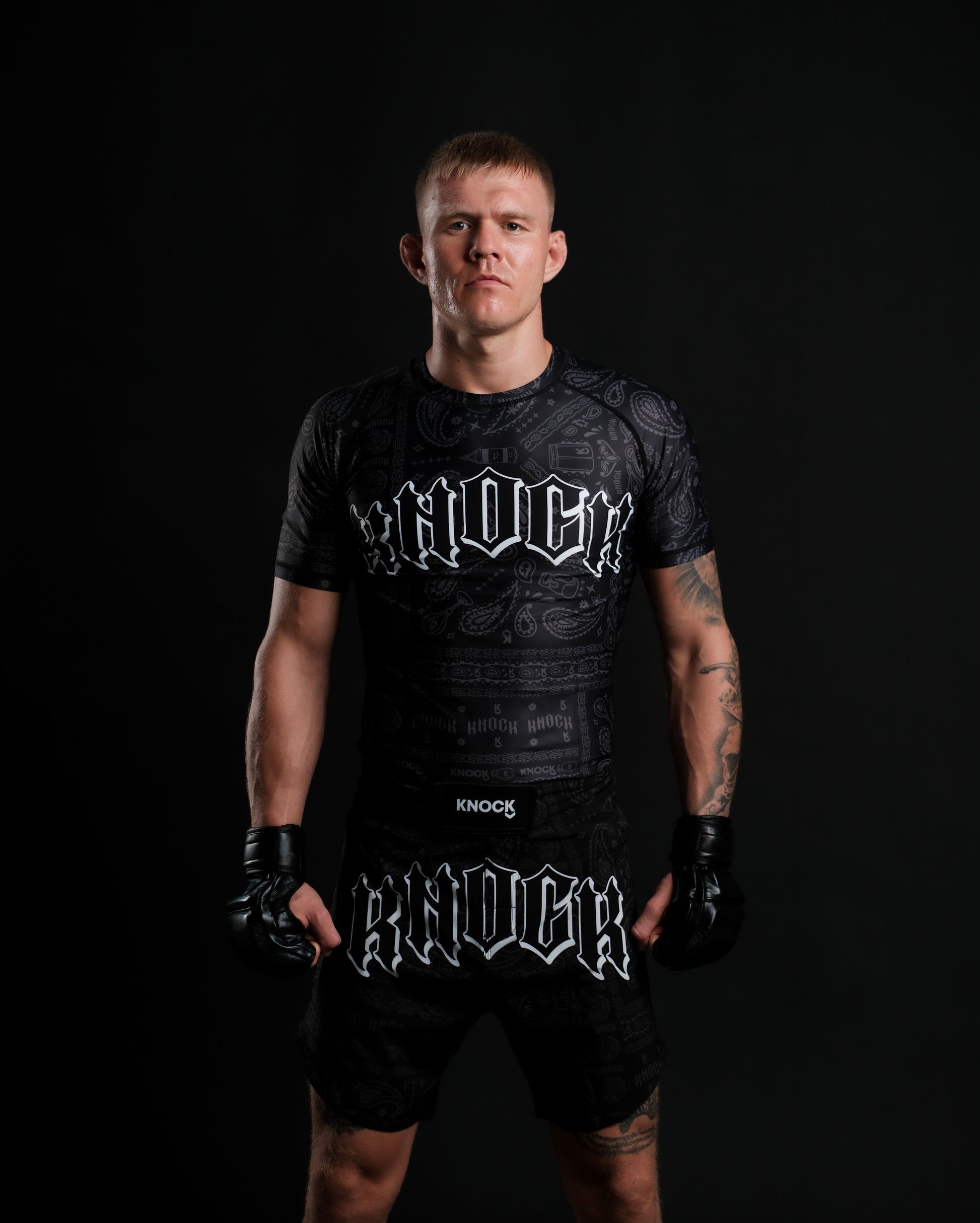 Built for those who live on the mat and fight with intent, the Real Ones Only Rashguard combines combat-ready function with fearless design. Featuring a blackout paisley print laced with hidden symbols and bold gothic “KNOCK” branding across the chest, this rashguard is more than gear—it’s armor with an edge.