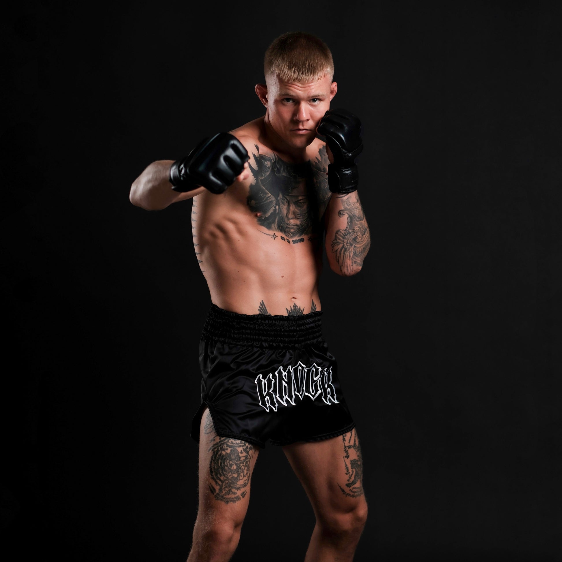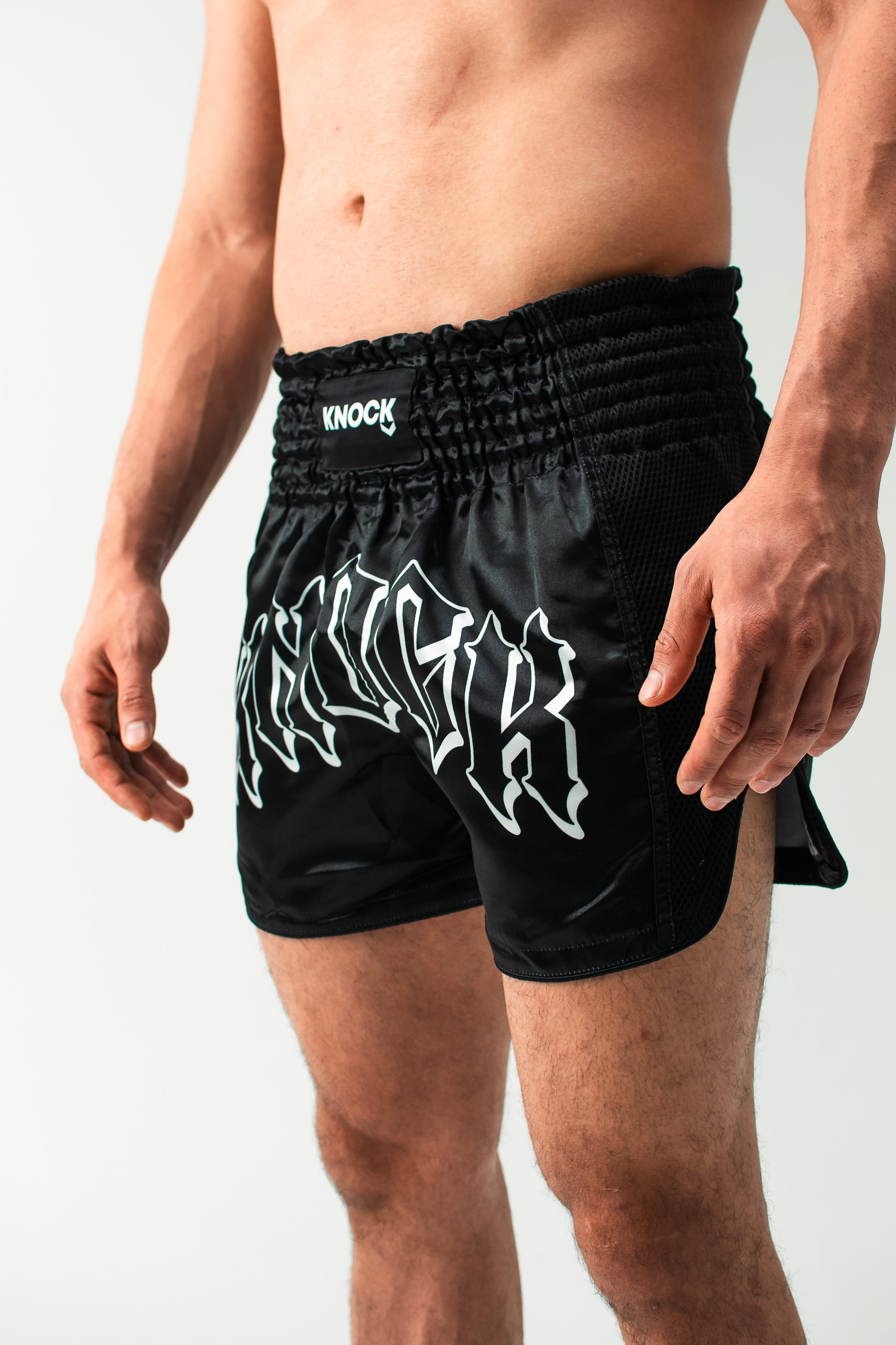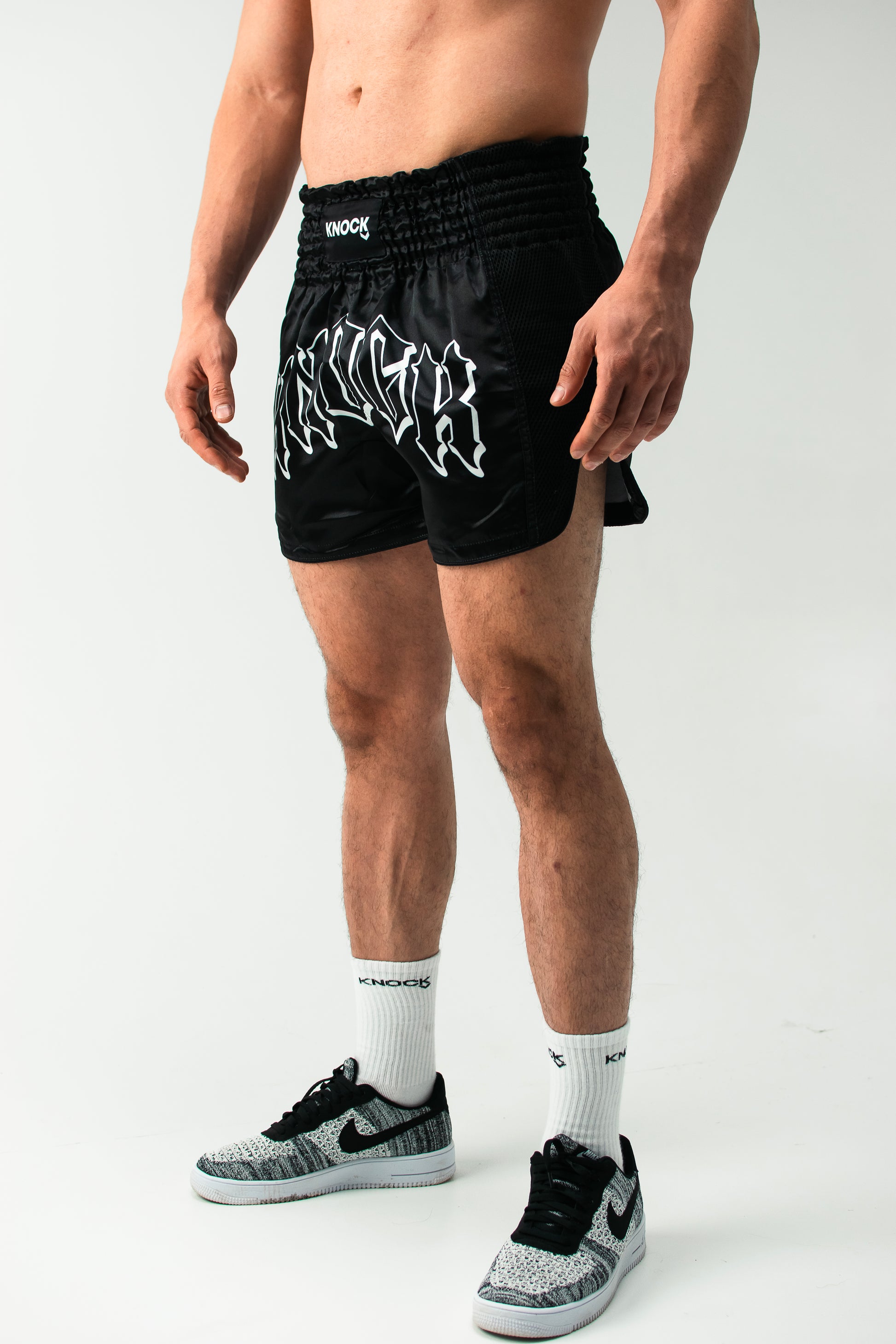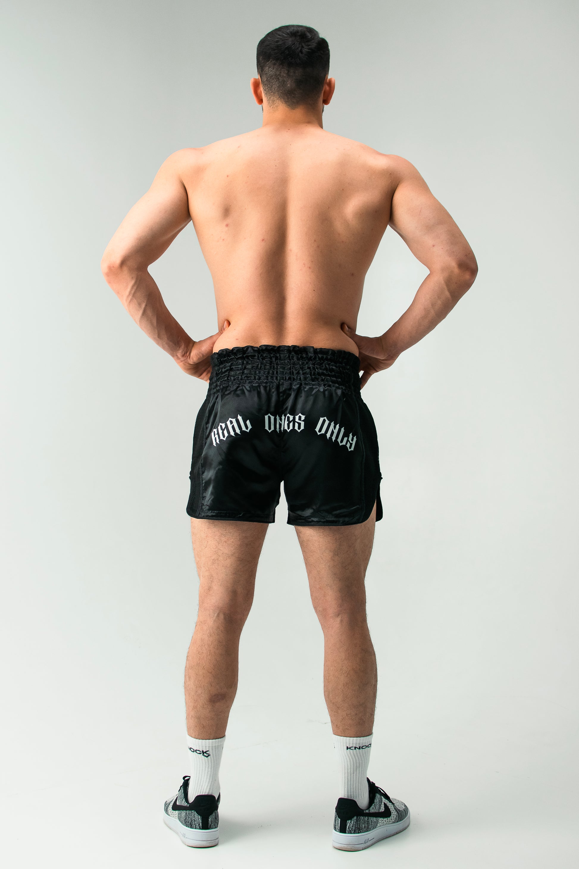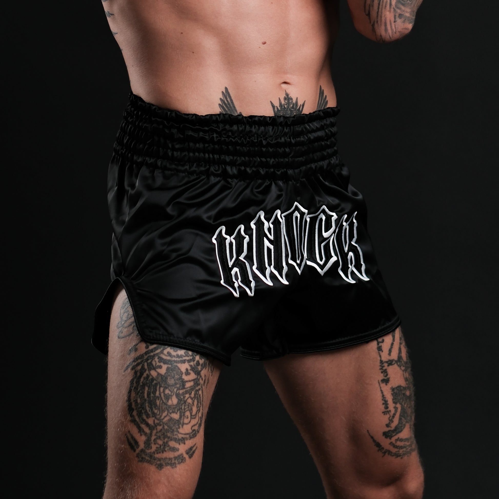 Step into the ring with purpose in the Knock Muay Thai Shorts – Black Edition, built for fighters who represent the “Real Ones Only.” These shorts feature a bold printed “KNOCK” graphic on the front in a sharp gothic font, with “Real Ones Only” printed across the back — a statement of authenticity, grit, and dedication.